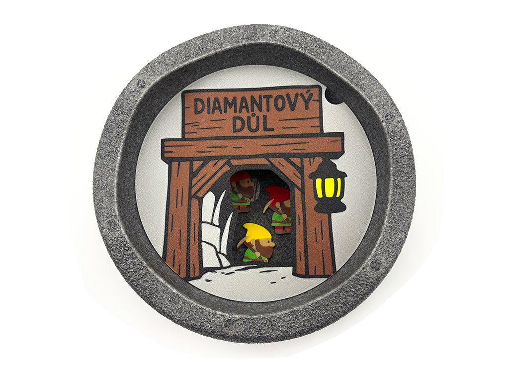 Diamantový důl z 7 trpaslíků se vstupem do dolu pro miniatury trpaslík. Pomocí pinzety nebo dětskými prstíky postupně přidávejte do dolu trpaslíky. Diamantový důl lze "krmit" i například různým sypkým materiálem (rýže nebo cizrna). Deska je kompatibilní s originálním kamenem od stapelstein.