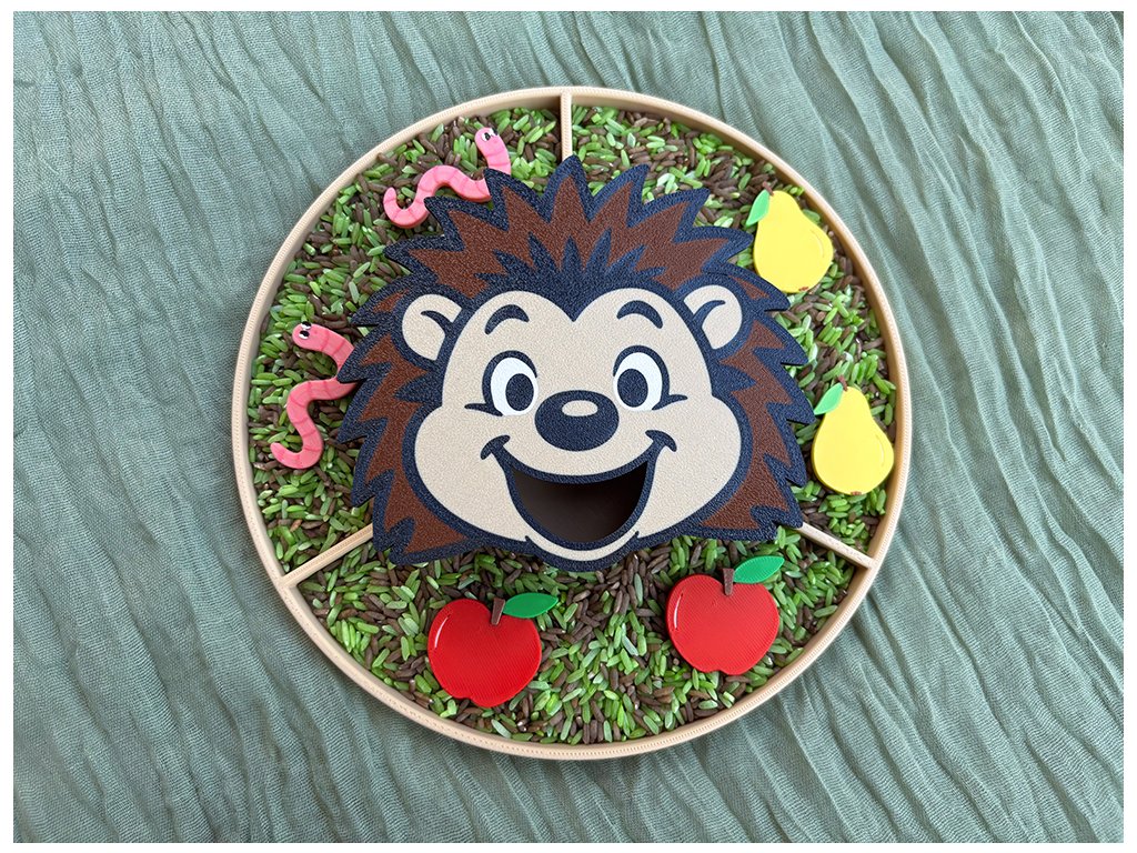 Do středu tácu umístěte jakékoli naše krmící zvířátko, postavu nebo budovu. Do zbylých částí můžete dát jakýkoli materiál (rýži, cizrnu, kinetický písek,..) + krmení pro dané zvířátko a zábava na jednom místě může začít.