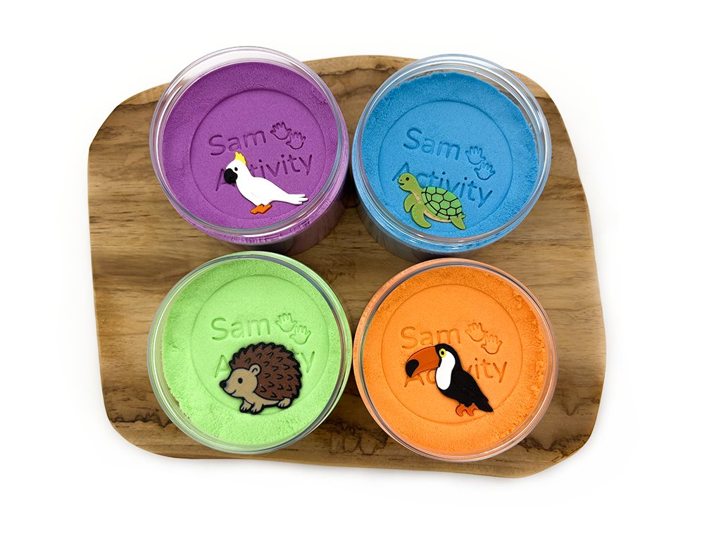 Kinetický písek je hebký, měkký a příjemný na dotek. Nechte si písek protékat mezi prsty, pouštějte ho z dlaně zpět na podložku, nebo ho umačkejte v dlaních do pevné koule a pak lehce narušte jeho strukturu. Písek se ihned začne pomalu rozpadat a téci.
