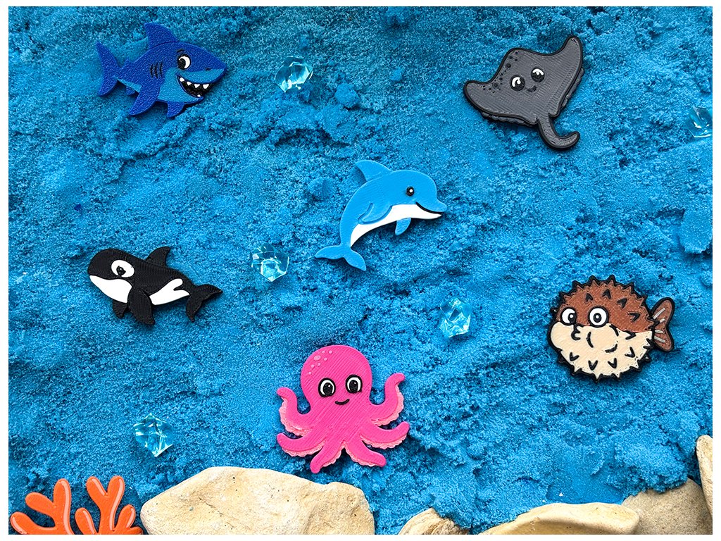 Miniatury pod hladinou. Lze použít jako dekorativní prvek k Vámi vymyšleným temátům/hrám. Dále jsou vhodné na obtisk do modelíny, či kinetického písku. Také je můžete poschovávat do barevného sypkého materiálu.