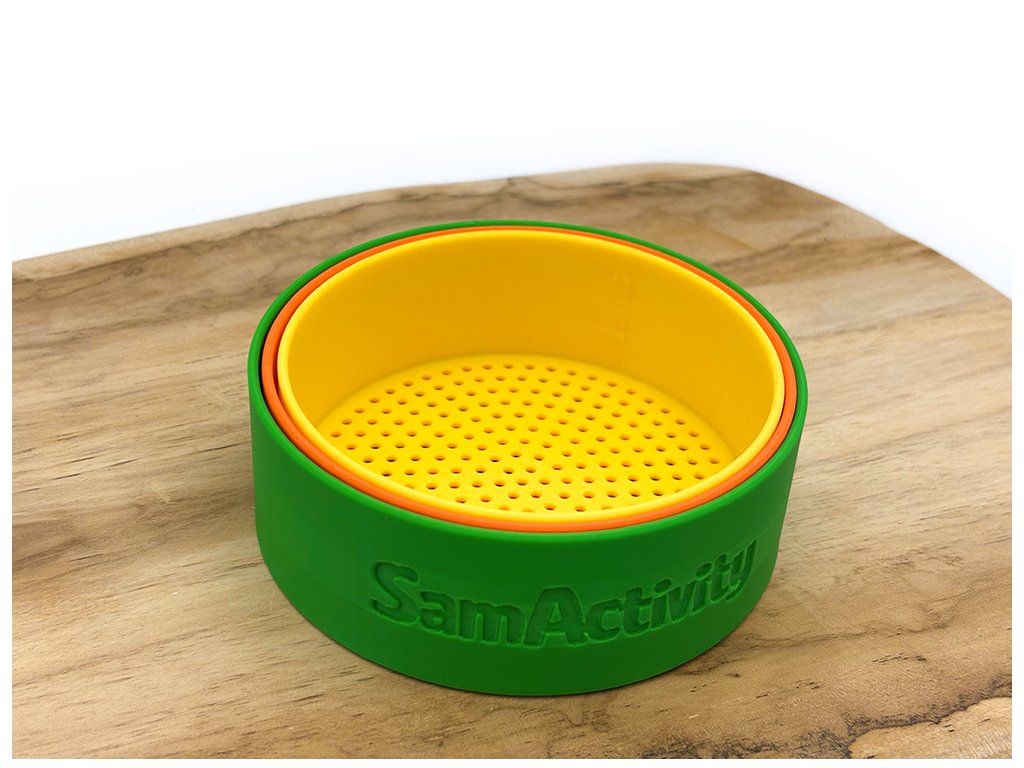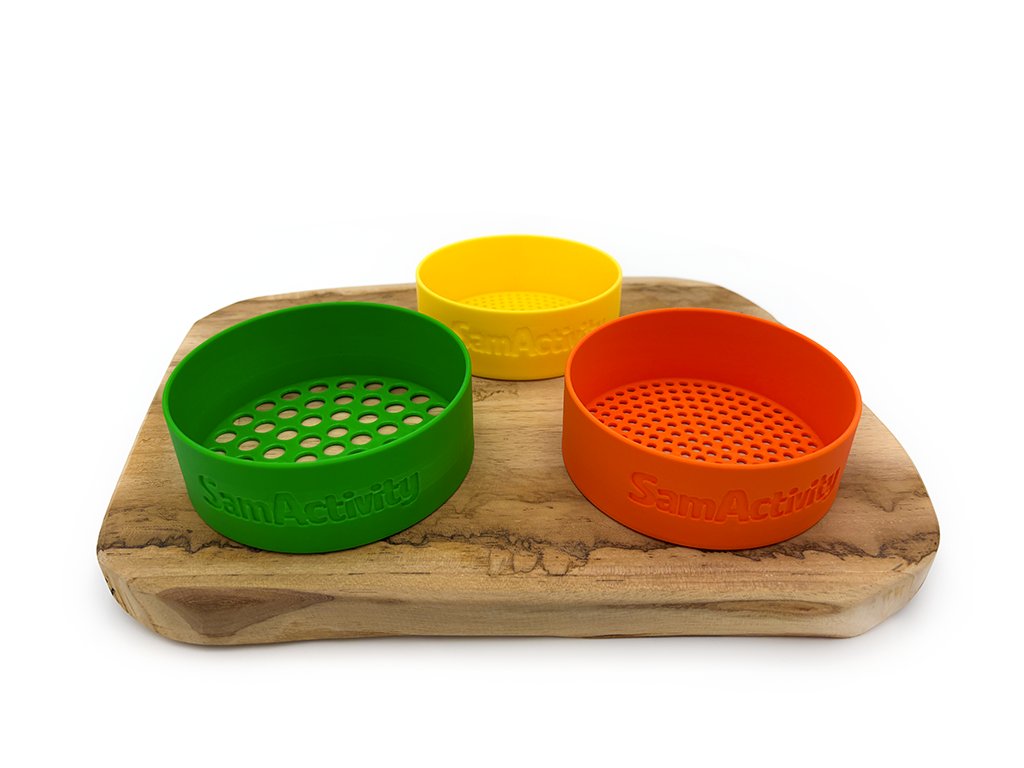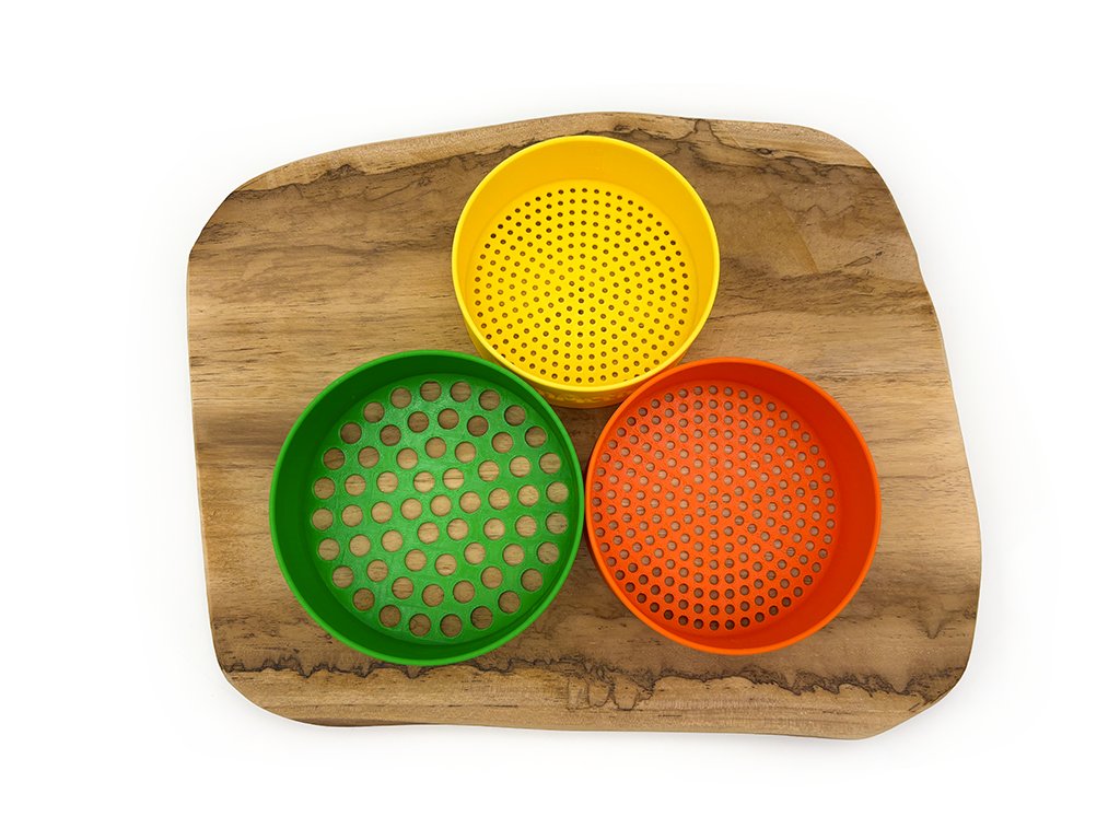 Hlavní výhodou našich sít je barevné rozlišení. Každá velikost má svou vlastní barvu. Děti tak okamžitě poznají, které síto použít, a třídění se stává přehlednější, rychlejší a zábavnější. Barvy zároveň podporují orientaci, samostatnost a hravou formu učení.